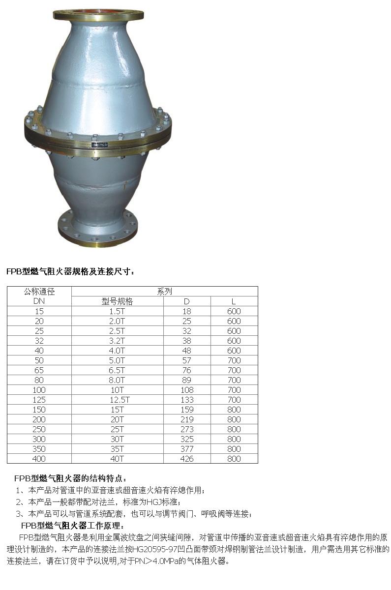 FPB型燃气阻火器广泛应用于冶金、化工等行业的天然气输送管道,如加热炉燃料气、石油液化气、煤矿瓦斯排放、也适用民用煤气管道。可有效地切断因高速气流中杂物与管壁急剧摩擦产生的火源,防止非正常情况下火焰在管道中的逆向传播。杜绝管道燃爆事故的发生。本阻火器的安全阻火速度1425m/s;极限阻火速度1605m/s。客户可直接将本产品与天然气管道的适当部位焊接连通即可运行。