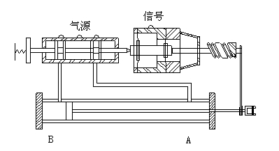 本执行器采用导阀式结构。在未输入信号时,气缸活塞处在B处底部,行程为零,当 0.02-0.1MPa信号输入阀门定位器气室时,由于气室左右膜片有效面积大小的差异,形成左右的压力差,使导向阀向左移动。气源进入气缸B室,A室排大气,A、B室存在压力差,推动活塞向前运行。这时弹簧牵引装置被活塞带动,弹簧被拉伸,当弹簧拉力和膜片气室作用力平衡时,阀芯退回起始位置,关闭A、B两室,活塞运动随之停止。输入信号的大小,决定阀门定位器气室压力差的大小,从而达到控制活塞杆的行程目的。根据所带功能附件的不同,可分为普通型、自锁型、反馈型、自锁反馈型和带行程开关型等五种型号。其中,反反馈和自锁反馈型根据安装位置的不同,又分有左型和右型两大类。
